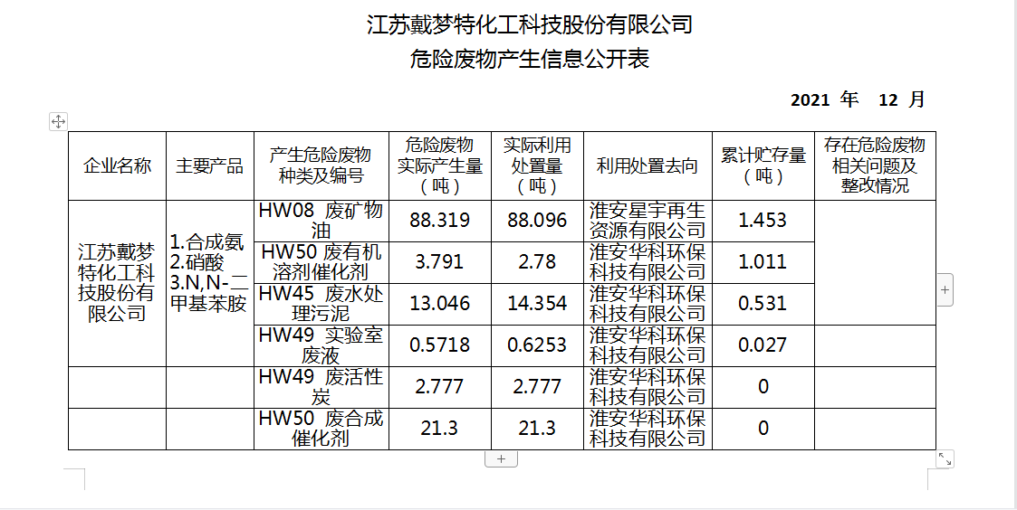 戴夢特2021年12月危險廢物產生信息公開表